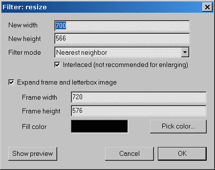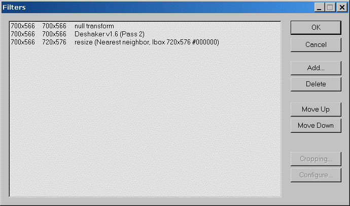 Instead of this resize filter, a small zoom factor (1.03) and directly setting 720x576 in the deshaker filter pass 2 could also do the job. The advantage: No black borders. Some additional blurring could occur. Such a small resizing, requiring to double only every 30th pixel, has hardly hardly any visible effects, with photos or progressive video pictures. With interlaced material like DV however, it always has twice as large effects in vertical direction at least, and perhaps additional problems with motion.