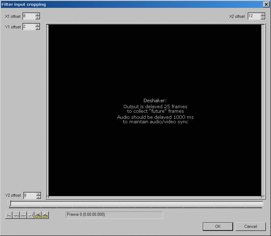 We use a 1 second (25 frame) area to get filling data for the borders. This will delay the output video by 1 second, but not the sound. You may enter an audio delay value (1000 msec. /audio/interleave) in VirtualDub to compensate for this. Other ways to cope with it are cutting off the start second when encoding MPEG2 and inserting the audio separately, or, just doing a direct stream copy with VirtualDub, with 1 second cut off and audio delayed 1 second. This takes some time and space but works in any case.