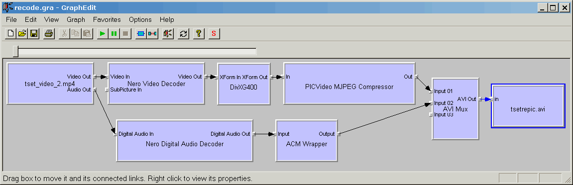 We start by simply dropping the .mp4 into Graphedit's window. It will automatically choose some filter chain to render the file. Basically, if we press the play (>) button, Graphedit will now play the file.