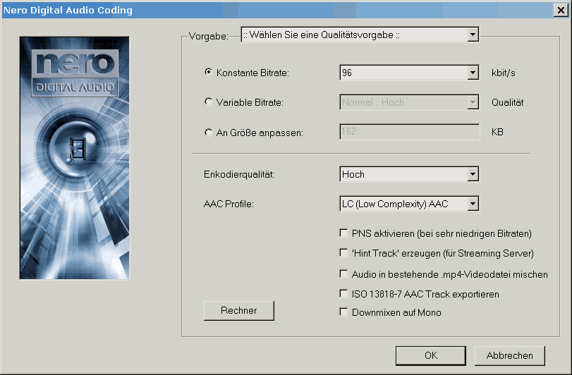 Although Nero can do HE-AAC, which is still better than ordinary AAC, we will get problems multiplexing HE-AAC. So we stick with standard CBR AAC for safety. 96 kbps is already very good.