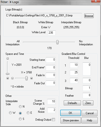 Now add the Xlogo filter in VirtualDub and open it. Use the "browse" button to open your logo files: Selecting the ...-0.BMP file automatically opens both, as the 'Black' and 'Interpolate' versions ('White' not needed). Play a little with the settings (use the preview) until the logo is perfectly removed with as little as possible blur imposed on the image itself.