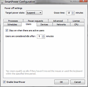 Attention: take care not to block "Smart power idle monitor" by your firewall. This task uses an IP connection over 127.0.0.0 to tell the main application if the user is active. So if your firewall asks, allow it.