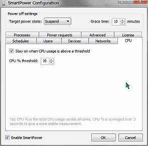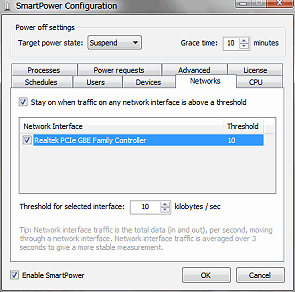 Open Smart Power and set the time for regular sleep (no user activity, here, 5 minutes, plus the grace time of 10 min.). Note that "suspend" will either result in standby or in suspend, depending on your general system settings. The other choice the program offers is "shutdown". | Next we set a minimum CPU load to stay awake. With CPU at 5%, you can probably also stop your computer from nodding off during large file transfers, but some background tasks may then keep the machine awake. Virus scanners etc. may need a high setting. | For network activities (downloads, etc.), choose a low value (sometimes connections go slow for a while, or maybe the data rate is misinterpreted if you have a Gigabit card). You perhaps may also want to set a longer "Grace time", for safety. |