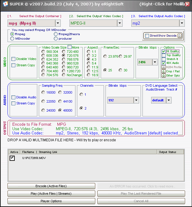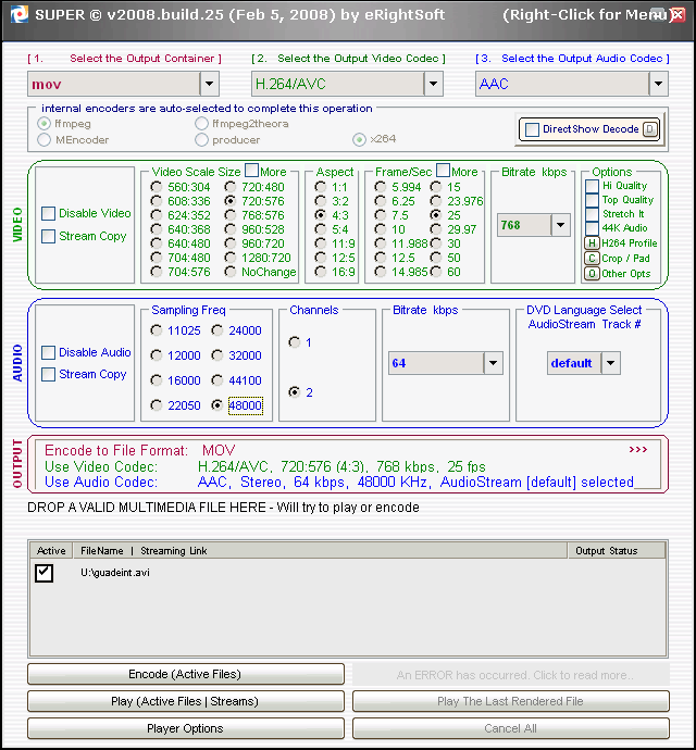This is just an example setting for a dense encoding of full resolution PAL video. Quite self explaining. Be aware that if you change one setting others may also change inadvertently, so check the entire selection again before you start transcoding. Also uncheck the 'high quality' boxes if you want to produce low bitrate videos or you bitrate setting will be overridden.