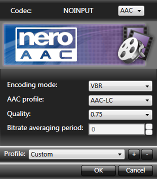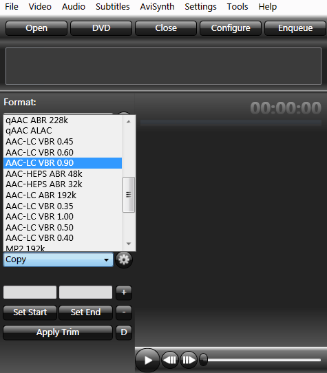 ![]() If you want to cut with Xvid4PSP, you need to re-encode. A compact choice of a format is AAC. There are several choices, I would normally take the one shown here... |