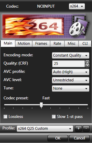![]() I checked this frame by frame for several HD TV sources an couldn't find visual differences. The H.264 encoder is really very good and I even use medium and Q 28 wherever quality is not very important. With SD sources on an HD TV set, or with very crisp HD sources, there is a small gain in crispness perceivable with a lower Q values. 22 to 25 are good choice in this case. Going to 20, the file size grows over proportional; can be considered master quality.. |
